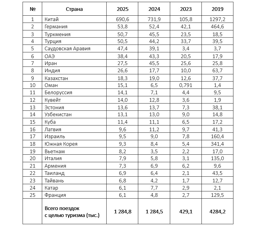 По данным Погранслужбы ФСБ РФ, за 9 месяцев 2025 года в Россию было совершено 1 284 825 турпоездок.
