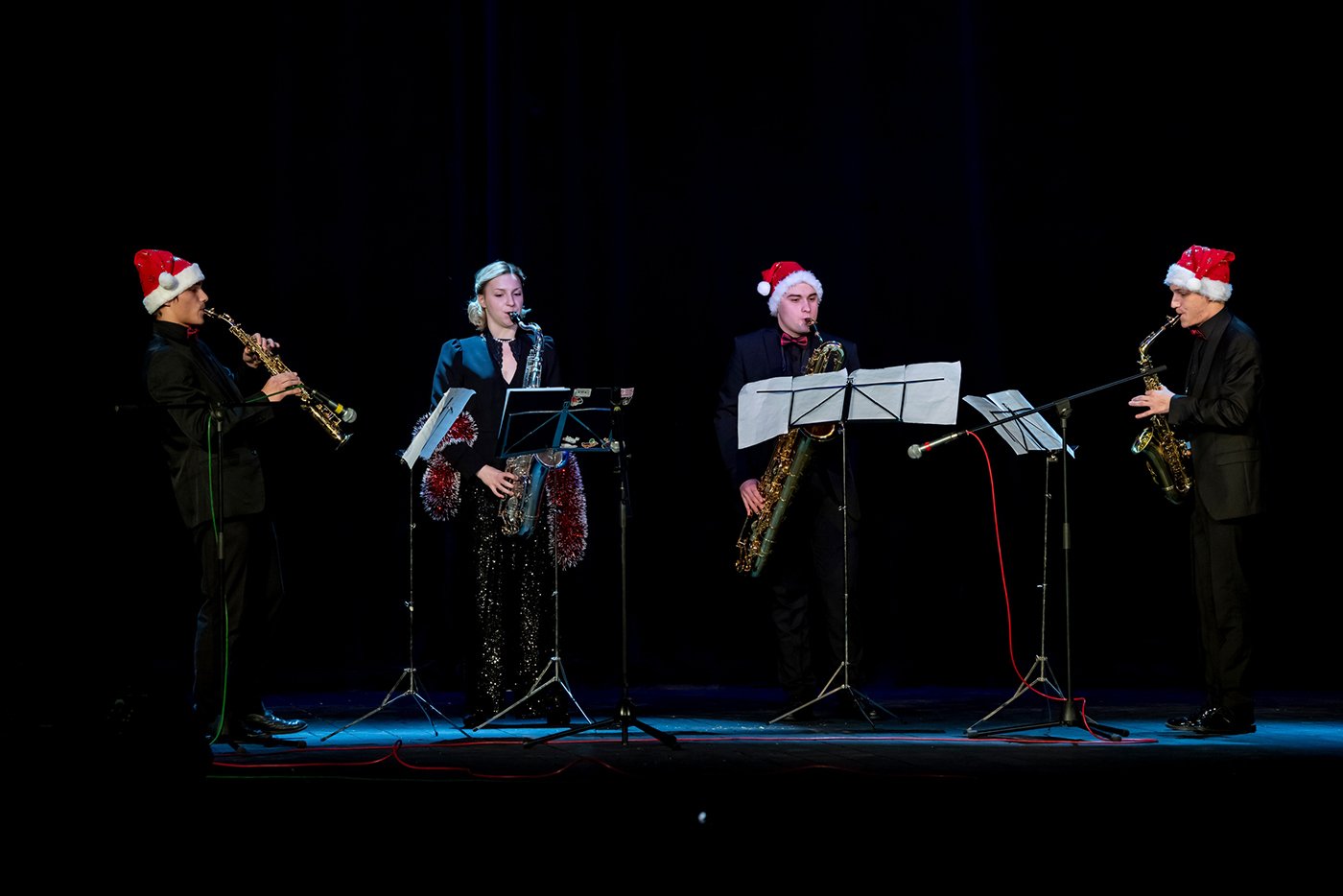 И еще номинация «Дети турбизнеса». Артемий Богачев (на фото крайний справа) неоднократно был участником всероссийских конкурсов «Туристический сувенир» в разных городах. Вместе с мамой представлял сувениры, заявленные на конкурс ивановской компанией «Грани». Артемий саксофонист, в декабре 2023-го выступал на нашем концерте соло. А в 2024 году создал квартет «Звуки городов». И сегодня с нами все четверо! Прозвучала увертюра к кинофильму «Дети капитана Гранта».