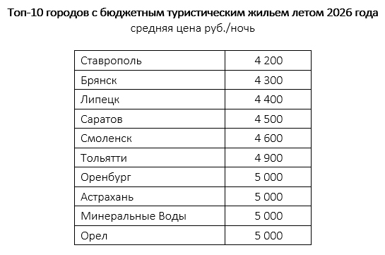Среди популярных локаций минимальная средняя цена зафиксирована в Ставрополе – 4 200 рублей за ночь. В топ по доступности размещения также вошли Астрахань и Минеральные Воды (по 5 000 рублей за ночь). Значительная часть позиций рейтинга приходится на города Центральной России – Брянск (4 300 рублей), Липецк (4 400 рублей), Смоленск (4 600 рублей), Орел (5 000 рублей), а также Поволжья – Саратов (4 500 рублей) и Тольятти (4 900 рублей). Таким образом, самые низкие цены на отели характерны преимущественно для городов вне ключевых туристических кластеров, где сезонные колебания спроса выражены слабее, чем на курортах.