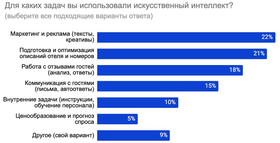 Согласно результатам опроса, среди основных задач, для которых представители отелей используют искусственный интеллект, лидируют маркетинговые и коммуникационные процессы.