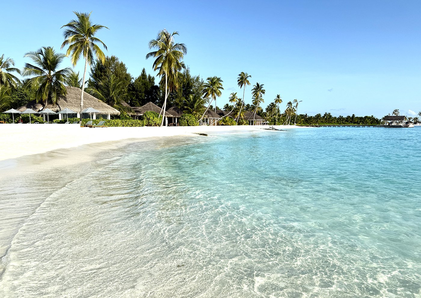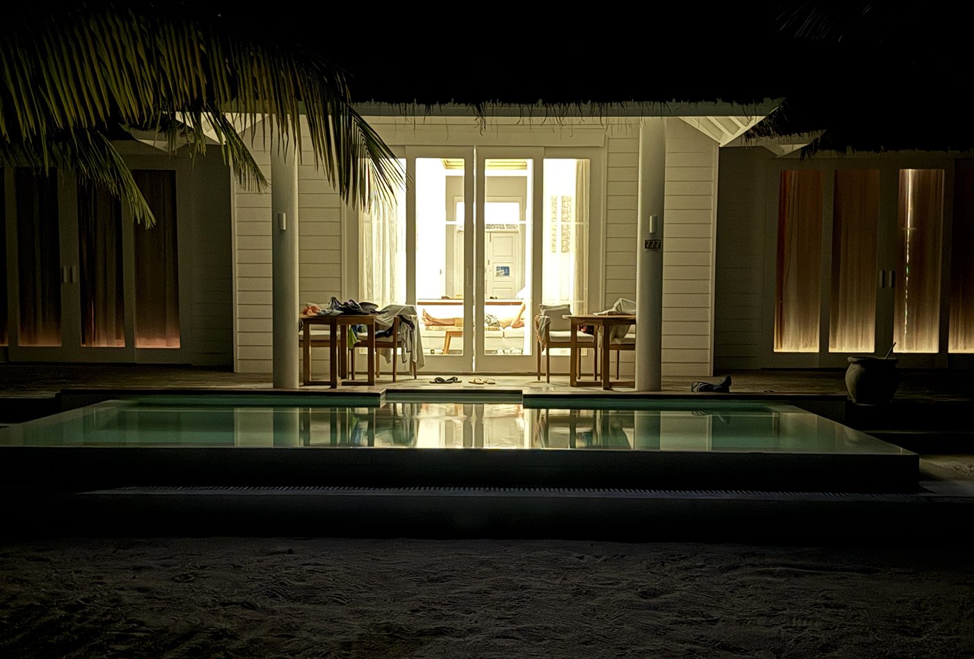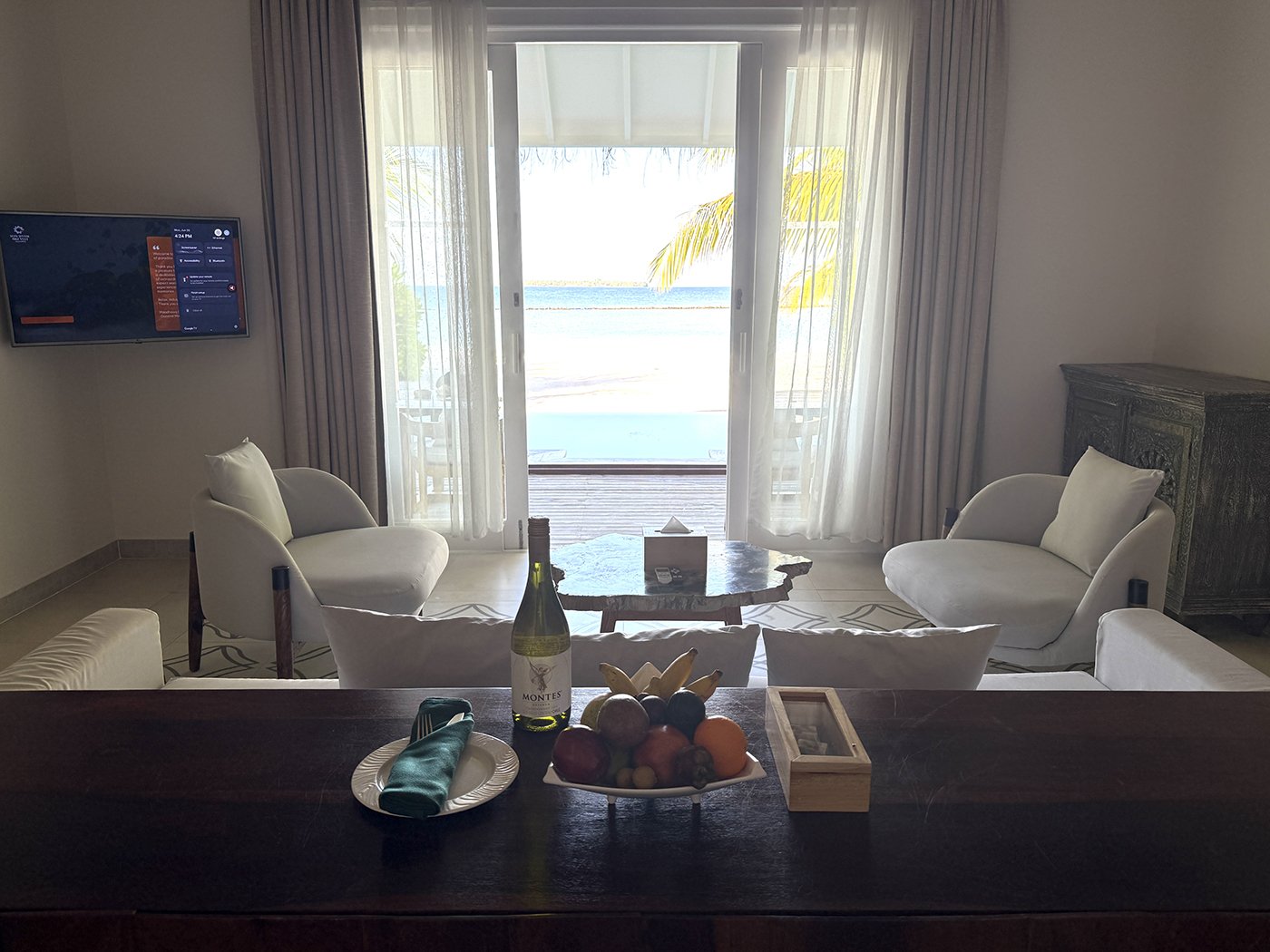 Следующая остановка – у бара, где гостям предлагают коктейли. Очень быстрая регистрация – и вы на пороге своей виллы у океана. Первая мысль – не верю, что это реальность. Но это всё правда: вокруг – только бирюзовая прозрачная вода, сияющий белый песок, который не греется на солнце и огромное синее небо, словно опрокинутое в воду.