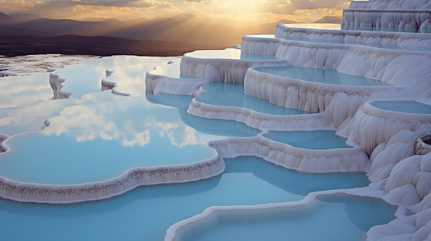 Самой большой достопримечательностью Памуккале и в то же время магнитом, ежегодно привлекающим толпы туристов, являются травертины, образованные из известняка, которые видны издалека в поле. Каскады белого цвета образовались на склонах горы Кэл. По склонам стекает горячая вода, температура которой превышает 35 oC. Она содержат много соединений кальция, которые выпадают в осадок и оседают в виде белого кальцитового налета. Этот процесс продолжается непрерывно на протяжении тысячелетий. На склоне наблюдаются чередующиеся сталактиты и неглубокие лужицы, наполненные водой. Вся система питается от ряда источников, в целебные свойства которых верили еще в древние времена. Для облегчения использования благотворного воздействия местных вод во 2 веке до н.э. здесь был построен город Иераполис, который посещали многие больные знатного происхождения. По сей день здесь сохранились руины римских построек, включая храмы, термы, некрополи и амфитеатр. Последний, который может вместить около 7000 человек был восстановлен в наше время.